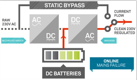 UPS online khắc phục được các sự cố mất điện, sút nguồn, hạ áp,… không có thời gian chuyển mạch hoặc thời gian chuyển mạch là 0ms.