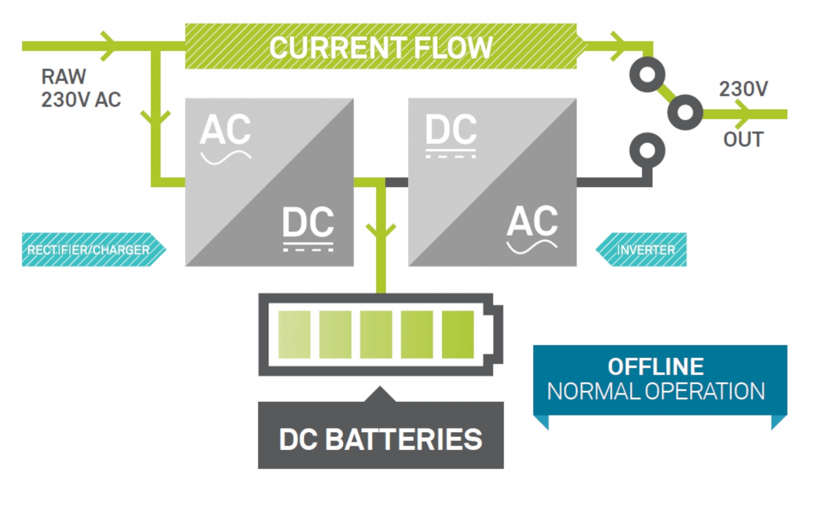 Thiết kế của dòng Offline chỉ thích hợp để sử dụng cho những thiết bị văn phòng, máy tính và những thiết bị có tính chất tải thuần trở; có thời gian chuyển mạch khoảng 10 ms (mili giây) và không thể mở rộng thời gian lưu điện bằng ắc quy lưu điện gắn trong và cả gắn ngoài; không hỗ trợ chức năng ổn áp.